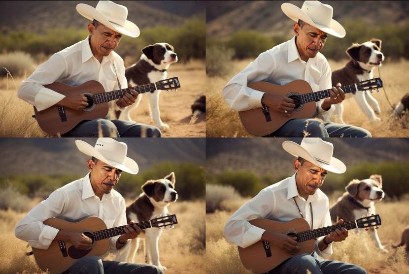 obama, Cowboy hat, ukulele playing, meadow in the background, white puppy looking in front, realistic photo --ar 3:2 --s 750 --v 5