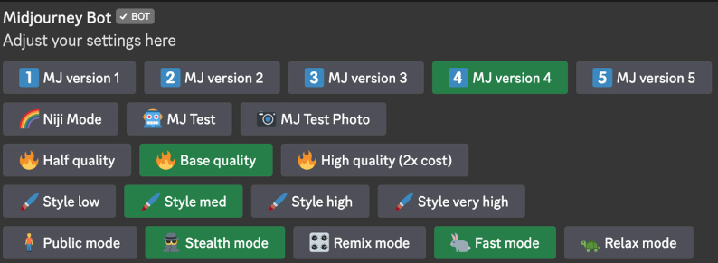 미드저니 모델 버전과 스타일, 품질, 업스케일러 등 일반적인 옵션에 대한 토글 버튼이 화면에 보입니다.