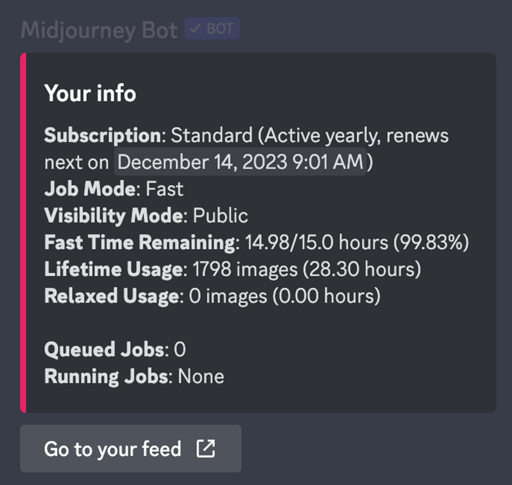 /info 명령어를 사용하여 대기/실행 중인 작업과 구독 유형, 갱신일 등 사용자 정보 확인이 가능합니다.